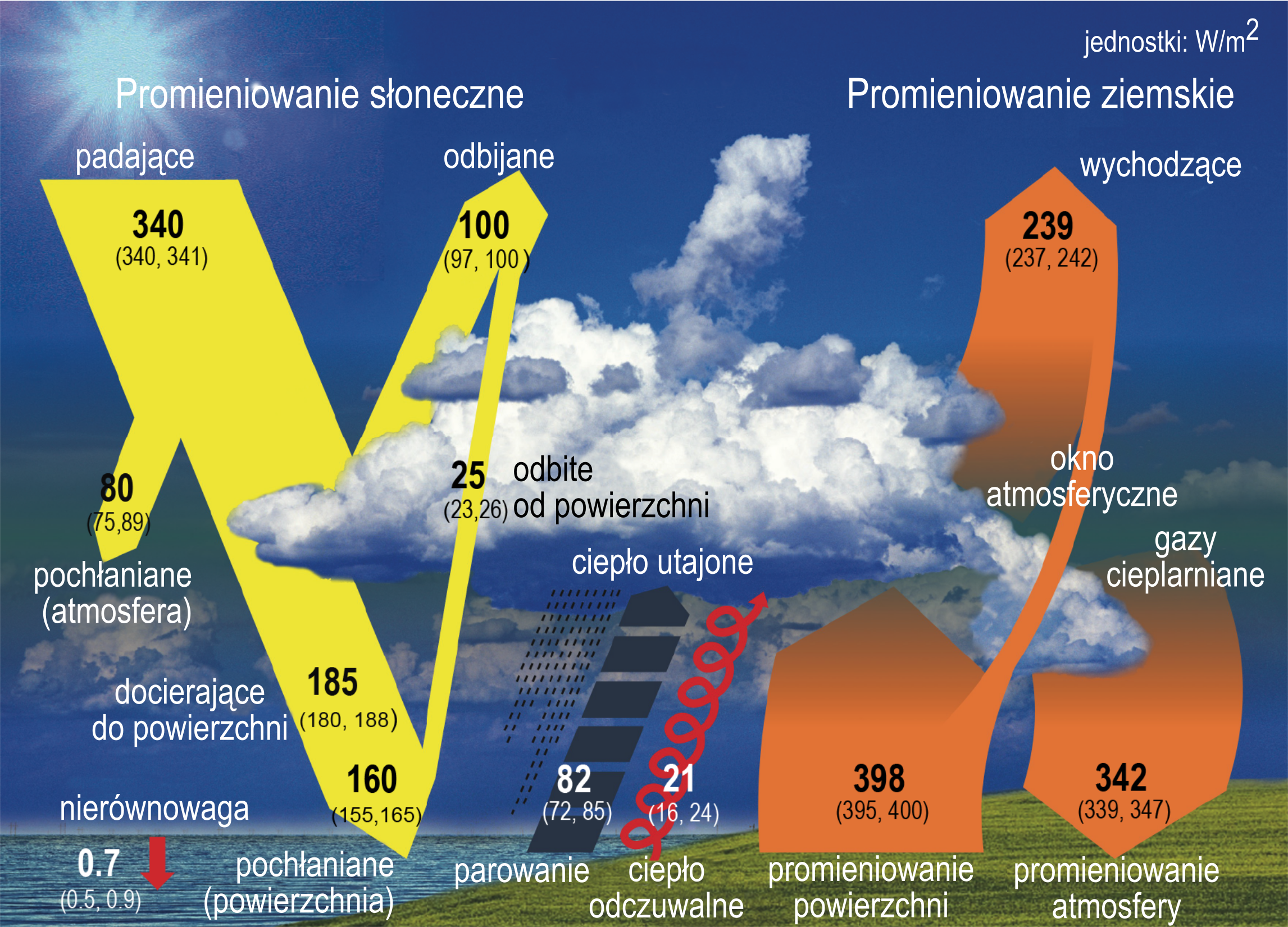 Poniższa grafika przedstawia bilans energetyczny Ziemi w przeliczeniu na metr kwadratowy powierzchni planety i pochodzi z szóstego raportu IPCC. Wartości są zaokrąglone.